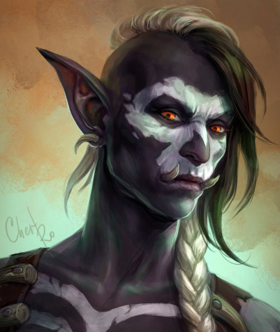 "The orc had to bend their head slightly when passing through the door. Tall, even for an orc, but slender and long-limbed. The same skeletal makeup shines over their dark skin. Wearing no more than very light padded armor, and a furred coat."