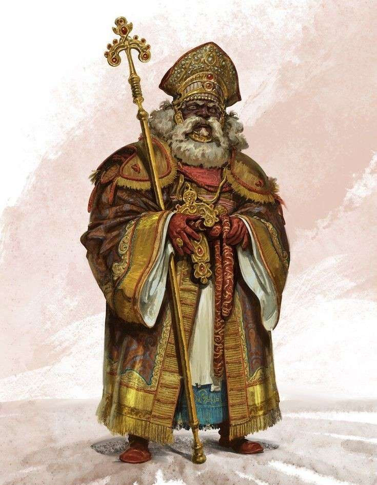 He had darker, wrinkled skin, and wore golden (which sometimes shifted to silver or grey), brown, and reddish garments, and religious regalia. He had a long grey beard, and a glowing halo.