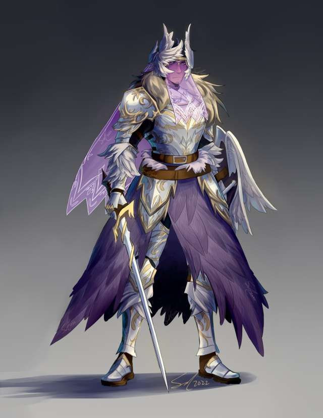 The Knight is clad in silvery, polished metal. Purple, beige and white furs hang from their waist and peek out between armour pieces; a lavander cape vaguely reminiscent of translucent, ethereal insect wings, and a matching veil flow down their back, and the front of their face, like streams and waterfalls of fragrant wine. Their visage, consequently, is obscured, and you cannot make out any features clearly, though you sense hints of otherworldly beaty anyway. Winged and feathery shapes are incorporated into their armour and shield; in their other hand is a mace with a long, vine-wrapped handle, topped by a pinecone of wickedly sharpened metal. - Viktor |