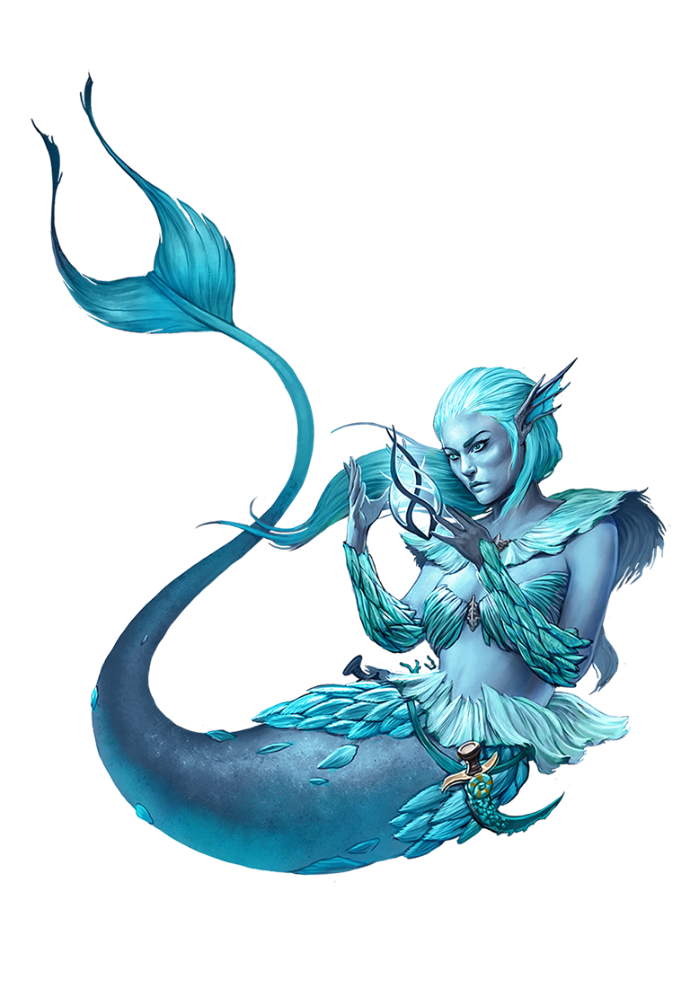Elegant, mysterious, and graceful; all this and more can be said of the merfolk. These enigmatic people resemble humanoids with delicate features from the waist up but with the fins and tail of a massive fish from the waist down. Found in nearly all of Golarion’s oceans, merfolk are as varied in appearance as humans, their skin ranging from pale to umber and all shades in between, while their gleaming scales shimmer with the majesty of the sea.