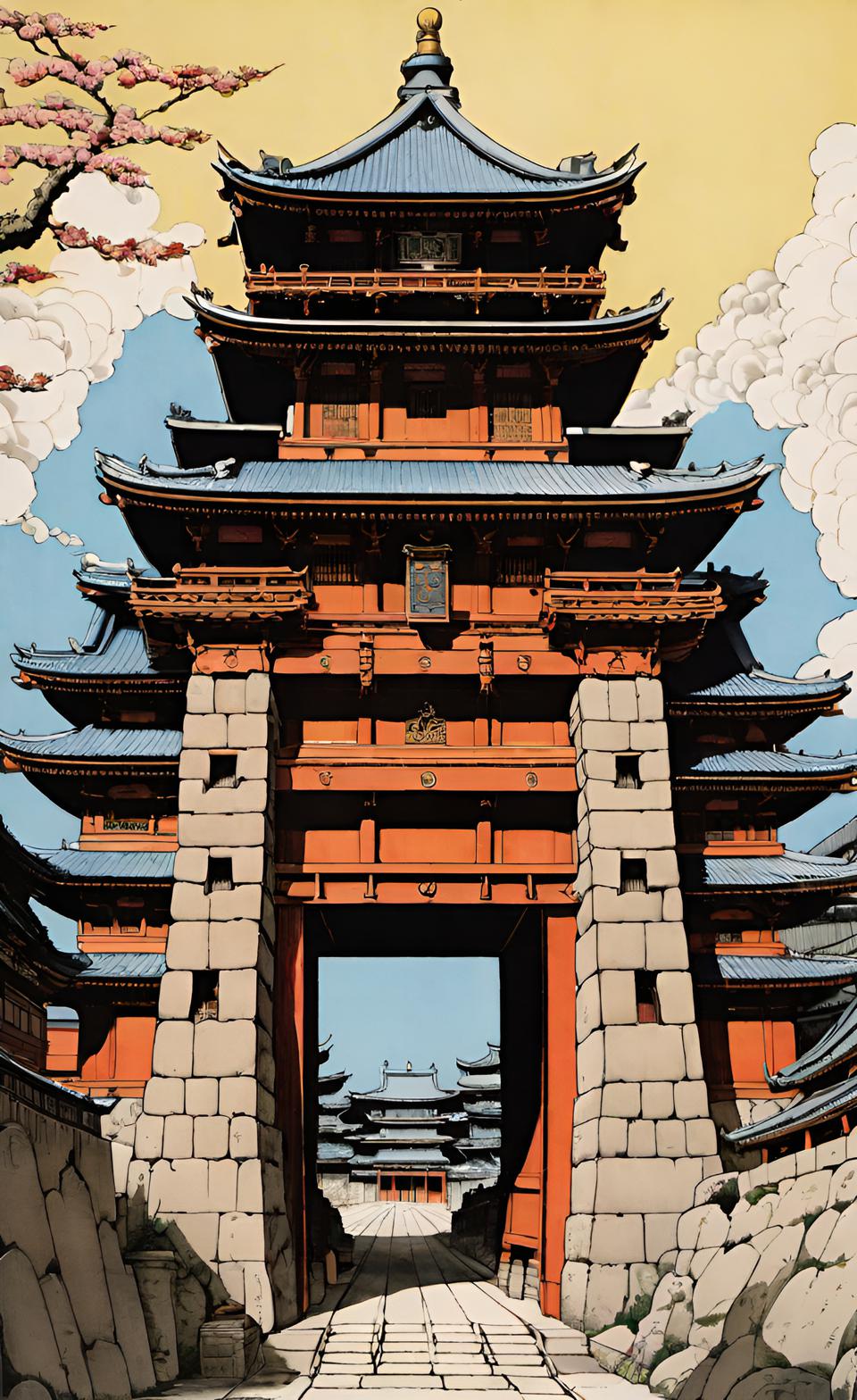 KOMACHI'S TRAVEL GUIDE: This magnificent EJ structure was built by the architect Kenchikuka during the reign of Hantei the Fifteenth. The gates are made of stone, andeach is carved with five twining dragons. There is a lever inside the tower which can easily be moved by a young child; when the lever is to the right, the doors can barely be opened by five strong men. When the lever is to the right, however, a hidden series ofrollers shifts the balance of the doors - and they can be pushed open by a single person. No one is sure how Kenchikuka engineered this; the entire gate would have to be dismantled to examine the workings of the lever, and the architect only allowed the workmen to work on the mechanism for a single day each, so that no one saw all the parts. Shugenja have examined it and declare that it is not the work of awakened spirits; they've poured water into the workings and then interrogated the water spirits, but to little effect, since the interior is too dark to see the gears. It remains a mystery to this day.