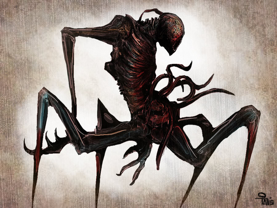 The Tasmanian horror is a cryptid that inhabits the Tasmanian highlands. It possesses six limbs; four sharp-ended legs and two arms with dextrous hands. It is an agile and intelligent carnivore, well-suited to life in the volcanic region it lives in. Furthermore, it possesses a series of tentacles on its abdomen, with which it holds on to dead prey for open-air digestion by acid. This helps consuming the strong, well-protected creatures that share its habitat. Tasmanian horrors frequently descend from the highlands to hunt for prey in Tasmania's mountainous jungles.