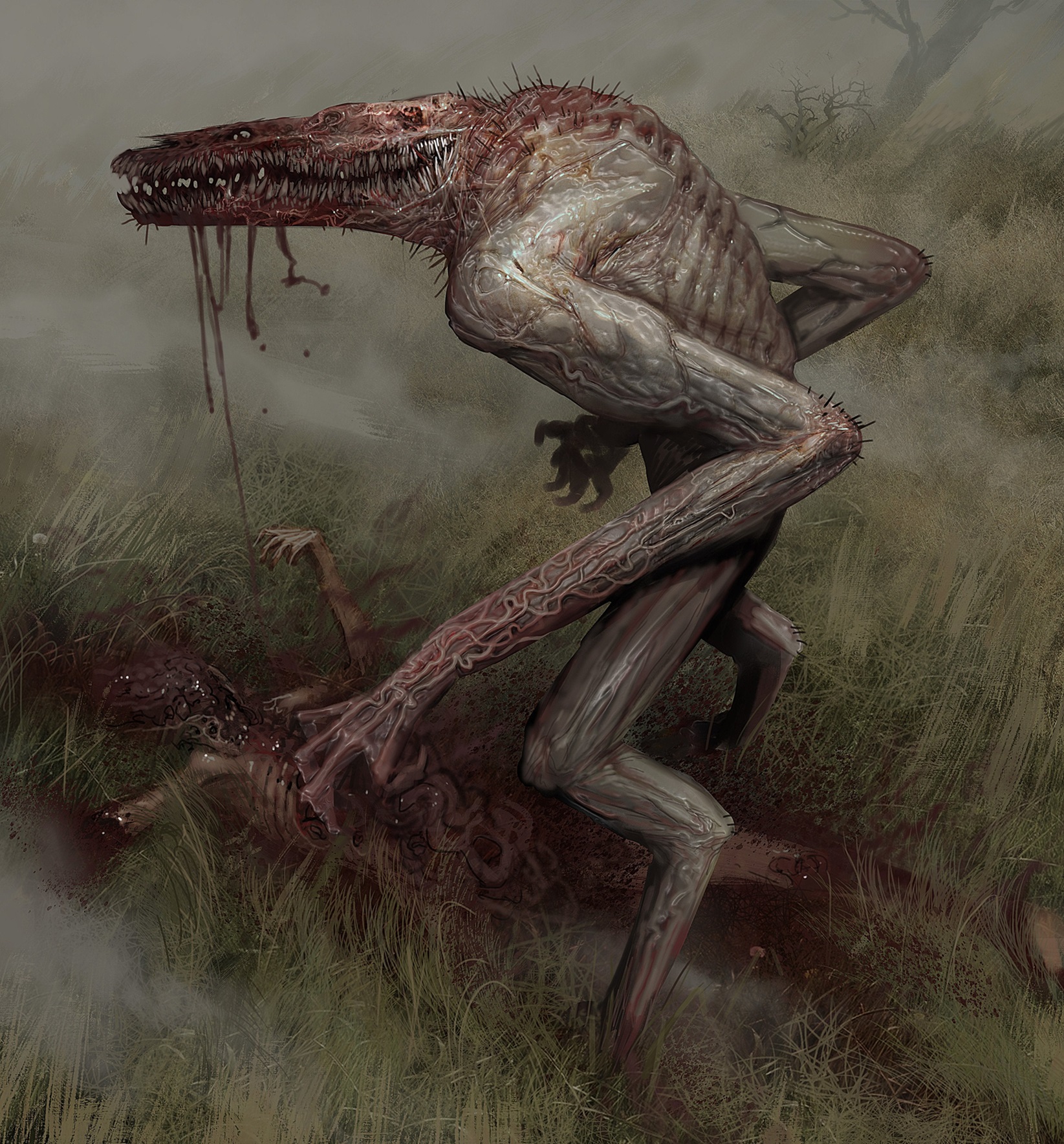 The bunyip is a carnivorous reptilian creature which inhabits Oceanyka's lower wetlands. It is believed to be distantly related to the Komodo Dragon. Bunyip possess a number of sensory organs in their head, which allows them to detect prey under murky waters and mud, striking with venomous sharp teeth which allow them to fight against much larger and more aggressive foes, and consume them afterwards. For this task, they usually camouflage themselves beneath mud or the waterline, pouncing on their prey when the time is right. These creatures are almost universally feared by human settlers in the regions they inhabit.