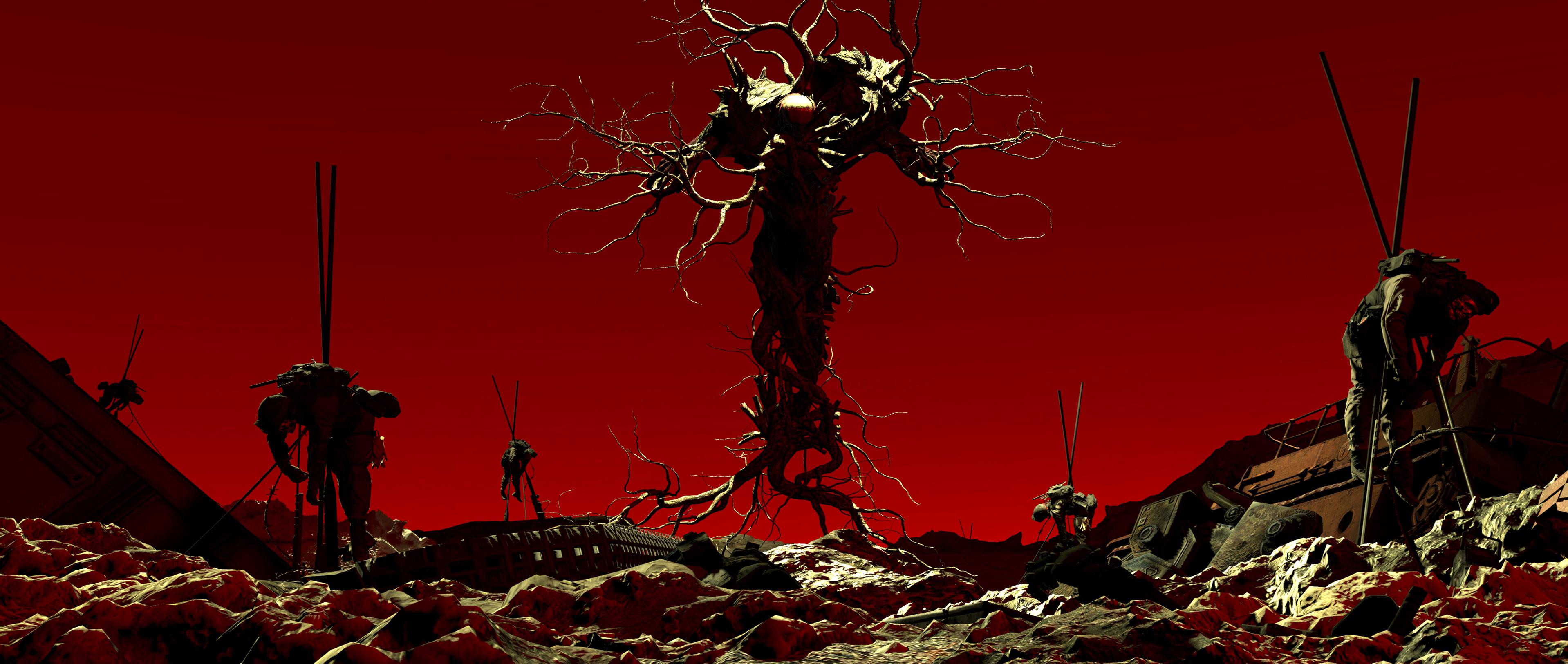 Ents were treelike creatures, and while their reproductive process is unknown, some "seeds" survived under extremely unique conditions. The creature that grows from these seeds is... different. Hundreds of thousands of years of preservation, and an environment that is no longer completely hospitable for them, have rendered what used to be a sentient Ent into nothing more than deadly psychic monsters under permanent agony, feeling nothing but feral hatred. The two most dangerous abilities an Ent remnant possesses is producing injectable xenogerms on the fly, causing their victim to mutate rapidly and violently, and manufacturing bio-carbines from local materials, which they operate with finesse using many flexible branches.. Extremely dangerous and potent fighters, but vulnerable to human firepower; flamethrowers, experimental vacuum bombs and, if all else fails, atomic warheads will make short work of them.