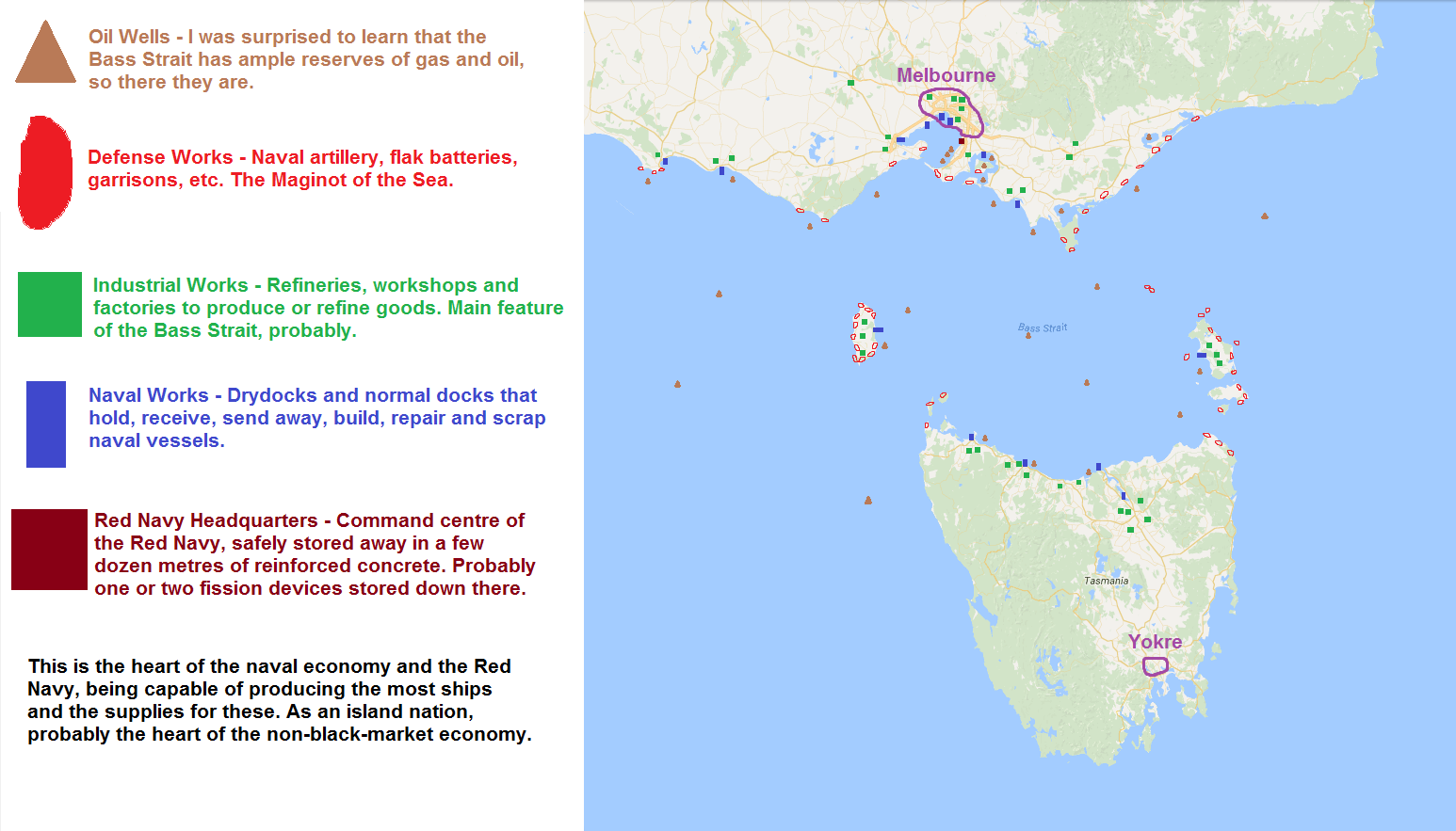 The Bass Strait Naval Complex is a collection of shipyards, oil fields, refineries, factories and naval bases which interconnect to form the Red Navy's industrial backbone. Most of its shells, missiles, cannons, torpedoes, radars, electronic systems, airframes, engines, powerplants and hulls are fabricated wholly or partially in this region, which sets it apart from other naval forces within the Oceanykan Federation (constantly struggling with resupply and maintenance). This has allowed Oceanyka to field the most potent navy of the Canton Protocol in the Pacific. The BSNC also produces large amounts of naval supplies and industrial goods for the civilian market, which make up a majority of Melbourne's economy. Fossil fuel products, merchant ships and passenger aircraft are the city's most important exports, and are all part of the BSNC's supply chain.