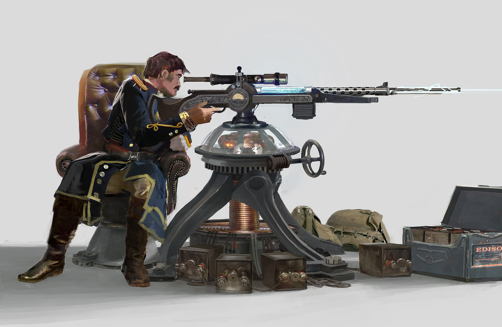 Tesla Electronics produces a unique type of advanced direct-energy weapon, operating on the electrolaser principle, which it calls the Lightning Gun. What this means is that as the weapon is fired, it ionises air in its path. A separate electrical connection then transmits an enormous current through this plasma channel. Its effects are varied and can be controlled by the user; it may stun its target (much like a taser), electrocute them to death or anything in between. Against complex machinery such as modern jet fighters and mechs, the Lightning Gun shows its fangs, frying the target's circuits. Most armour is also useless against it. Though the object itself is technically portable, contemporary power storage and generation methods are not, so it is mostly used as an emplaced defensive weapon.