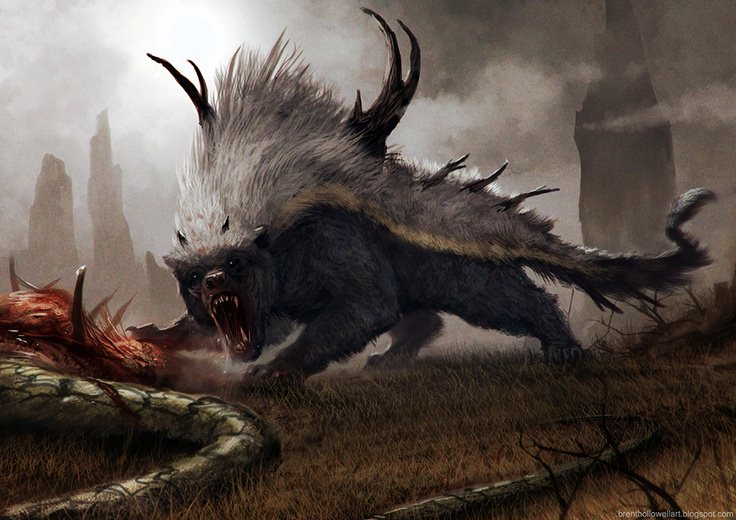 The Karlodon is a gigantic omnivore which primarily inhabits Oceanyka's northeastern wetlands. From head to tail it can measure up to 15 meters. Antler-like formations protrude from its back, the young ride on those for five years until they reach sexual maturity and can hunt on their own. It takes another 13 years for them to grow to their maximum size. The Karlodon has agility comparable to an oversized cat despite its enormous size, making it a capable predator. However it is an omnivore, and most of its nutrition comes from eating Eucalyptus tree leaves. It cannot gain many nutrients such as protein from this diet and will go hunting every so often. When threatened and cornered, a Karlodon will explosively release two different compounds from large glands located in its rear. The first is a cloud of fine neurotoxic particles that will contaminate an area in a radius of around 20 meters (it is immune to its own chemical attack through an exotic protein). The second is a foul-smelling gas capable of inducing shock and violent excretion from most orifices in a radius of 90~ meters, and in high enough concentrations can even induce coma. Such a repugnant smell can be detected by humans at up to three kilometers away; a telltale sign that the Karlodon lurks near.
