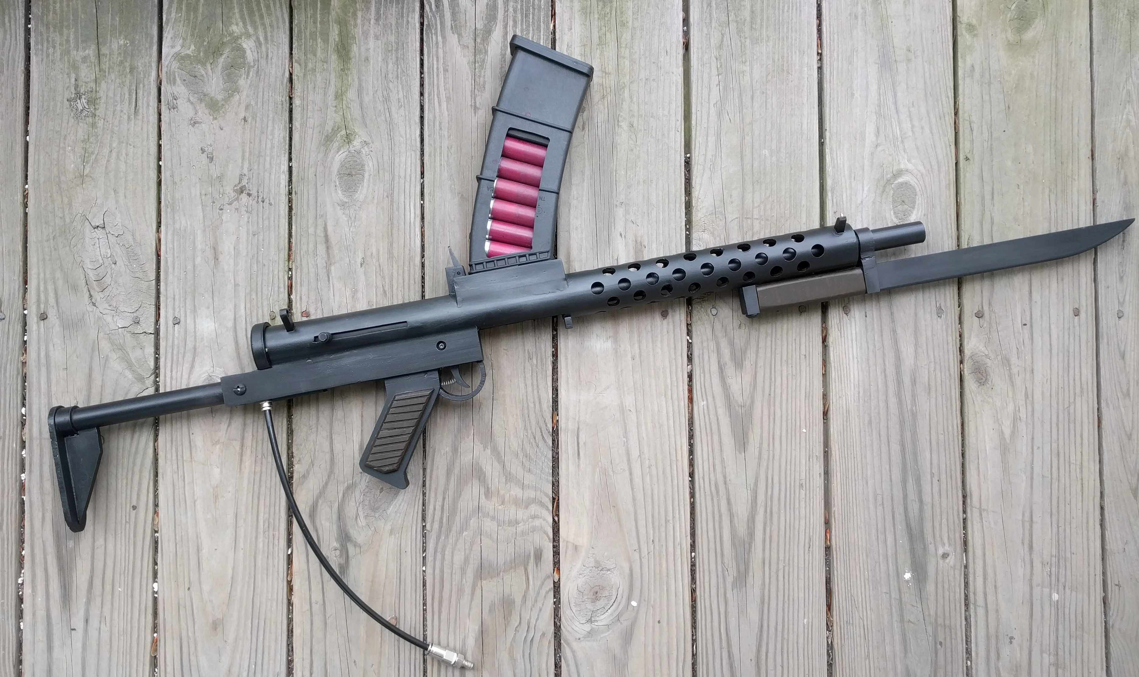 Nana guns are improvised bolt-action shotguns which feed from gravity magazines. They are no more complex than a collection of springs, tubes and sheet metal arranged somewhat logically. After each shot, the user must cock back the charging handle, which will allow another shell to fall into the chamber. Beware leaving the bolt open, as the magazine may empty itself on the ground. Because these weapons do not have the strongest action, most of them are chambered in the lighter-shooting 20-gauge.