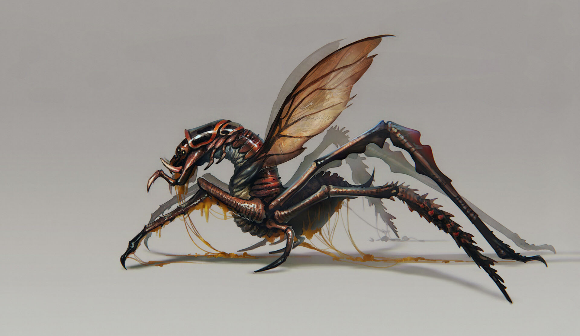 The Locust Ant Queen is the undisputed monarch of any Locust Ant colony. It is some four metres long and a metre and a half in height, weighing nearly half a ton. Its Bioferrite-tipped mandibles can tear through thin armour with ease, while their exoskeleton allows them to block lesser blows. Locust Ant Queens are capable of flight and can spray acid much farther than their lesser forms. They are equipped with a stinger-like ovipositor with which the creature violates a prey's body, turning them into a Living Incubator for the colony's growth. This method, which ensures the young have an ample and self-sustaining food supply for a few days, is preferred by the species over simply laying the eggs upon the colony's chambers and feeding them manually, and is required to produce new queens, which emigrate from the colony with a few workers to found a new one of their own. Locust Ant Queens of the same immediate family are known to cooperate to achieve certain objectives, such as raiding and capturing large amounts of prey.