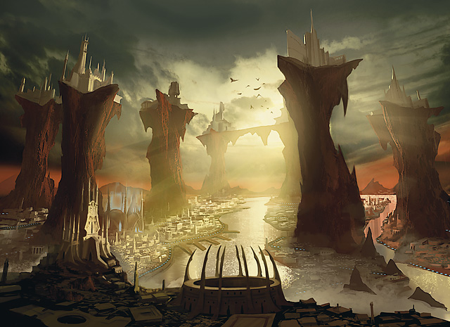 Once the capital of Galifar, Metrol was known as the Rising City, for many of its buildings stood atop soaring columns of rock that dared to scrape the heavens. The Cathedral of the Sovereign Host was the center for followers of that faith. The Vault served as the mint and treasury of Galifar, containing cultural treasures deemed too valuable to be displayed; salvagers dream of finding this “golden palace.” Floating gardens orbited the towering Royal Vermishard. Now lost, the beauty of Metrol lives only in Cyran memory.