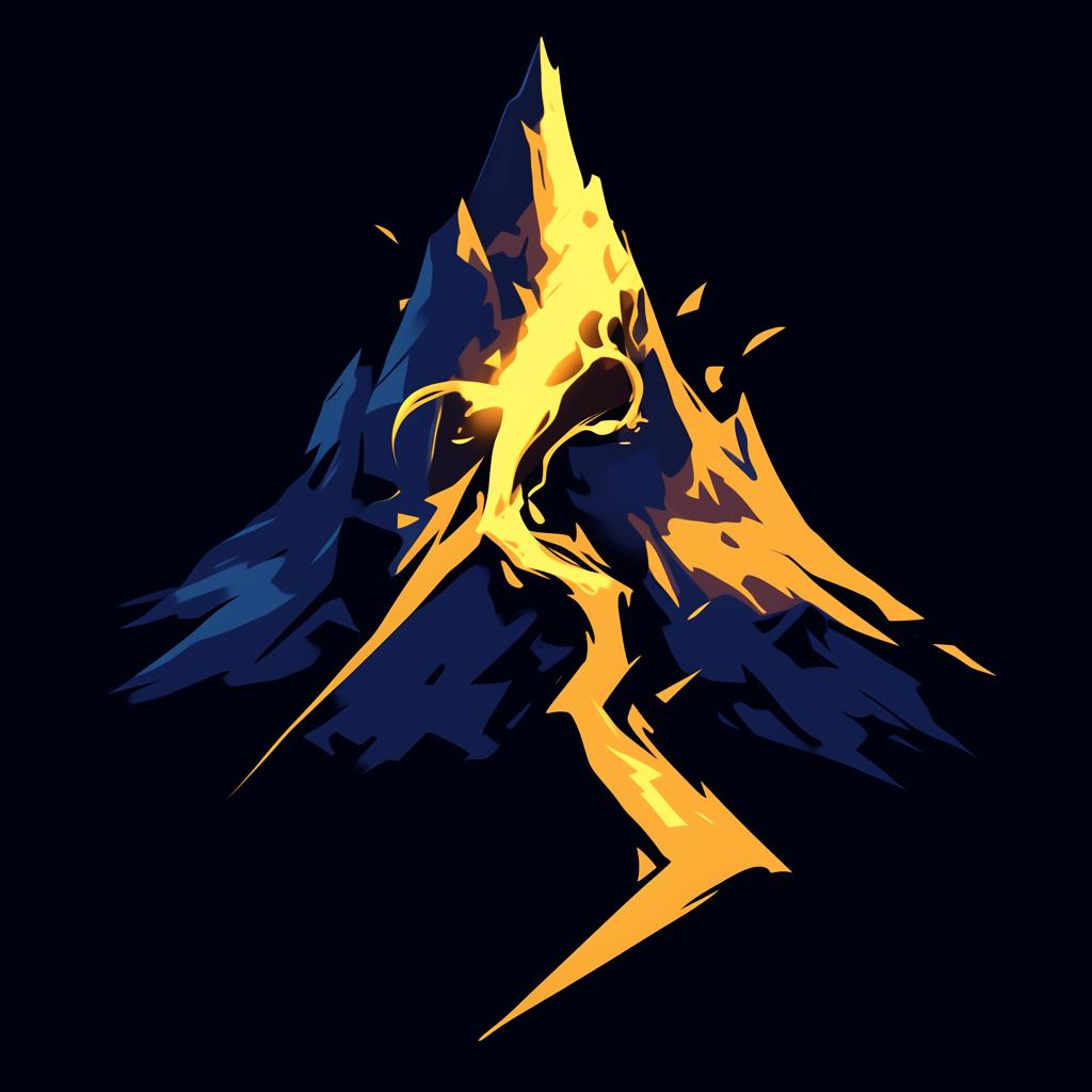 destruction potential.Logo: A shattered lightning bolt splitting a mountain in two.