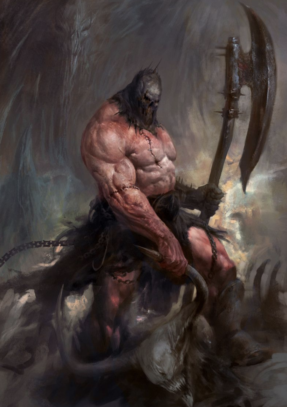 Under a hail of arrows and spears, the muscle-bound freak charges with surprising grace. Each step, leap-like, crushes cobblestone with alarming ease. One cannot ignore his presence. Barely dodging a blow to the flank, he greets the new threat with a glance and a snarl. “You should stay put”, he commands, a monstrous growl in his voice. With a pained grunt, he grips the haft of his axe, his arms now grotesque and hulking. He smiles and readies his first strike. Rarely did he need a second one