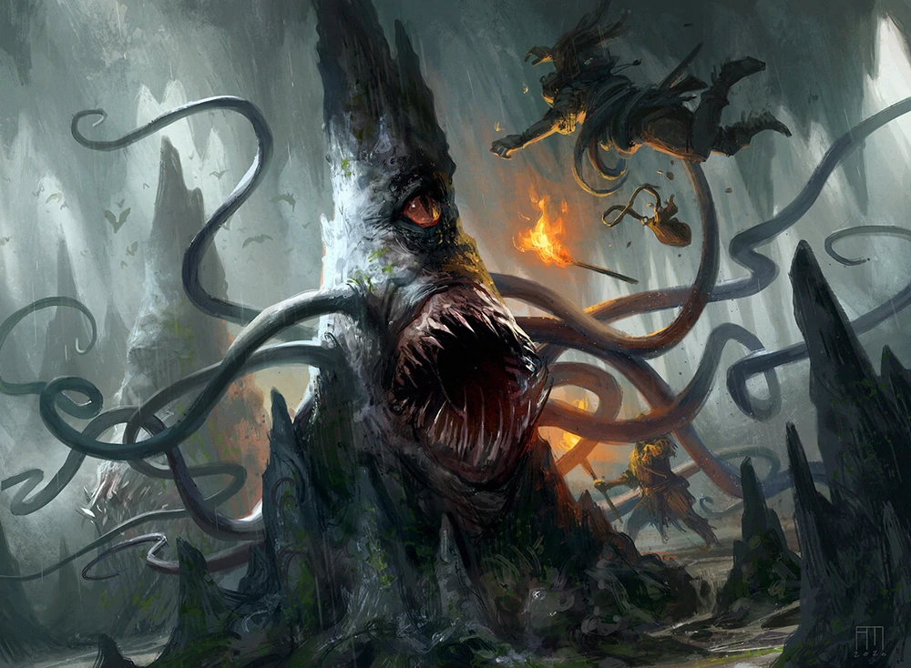 Several of the party members are suddenly grabbed by the tentacles of the roper, and as it reels them in close, it takes a bite out of the closest member, before some of them manage to break themselves free. The party quickly backs off, trying to avoid the tentacles, but it has a reach that spans all across the room, making it nearly impossible to go on the offensive and stay clear of the ropers' grasp at the same time. Unfortunately, backing too far off reveals the source of the constant feeling of being observed throughout the cave, as a pair of shadows have stalked the party ever since they entered, waiting for the right moment to strike.