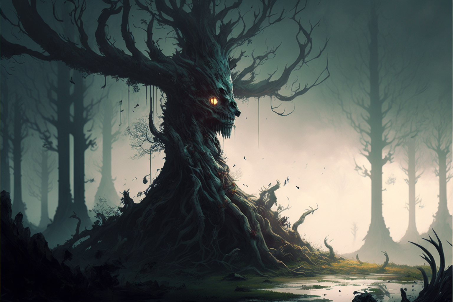 Reidoth, not taking any risks, wildshapes into a seagull to watch over the party from above. The party enters through the woods, and notices a bunch of various zombies roaming the forest surrounding Thundertree, and inwards. About two hours into their journey, they are suddenly confronted by three infected forest beings. They seem to use hearing and echolocation to find their prey, and seem to try to infect both Penny and Willowbark with some sort of sickness, but luckily, Kal, being a cleric of a THUNDER god, makes the foes regret attacking the group. It seems they are particularly susceptible to loud noises, and go down after a short battle. Not wanting to be overrun, as they did have to make a lot of noise, the group quietly leaves the area, traveling further inward towards the center of the corruption. With Willowbark in front leading the search, they find it without wasting too much time.
