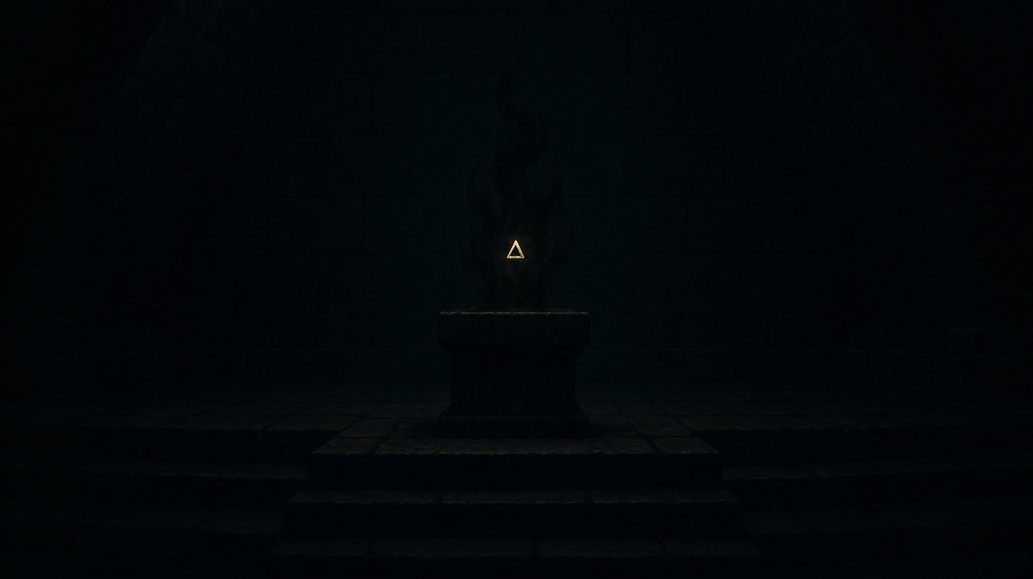 Inside, a massive pyramid shaped chamber, lit up by the same ever present light, but lesser than before. The walls seem to be made of a dark stone of sorts, and the corners are lined with what appears to be gold. In the middle of the chamber, the only thing of note can be found. A pillar, with a platinum triangle hovering in mid air, surrounded by black flames emanating from the pillar below. When they enter the chamber, they can see Vuthul even more clearly, almost completely, but still transparent. He smiles as he sees the artifact in front of them.