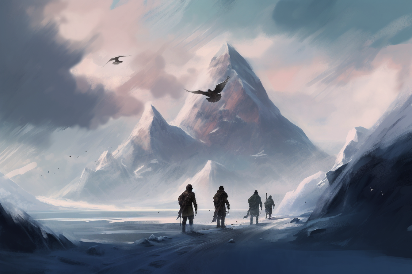 Going down the elevator and walking to the north to exit the mountain, the party dreads the journey ahead of them. It is an extremely windy morning, and a full on blizzard. They put on their snowshoes and sets out. The first day goes relatively fine, no orcs to be seen, no scary monsters, just bad weather, luckily the party has good cleather. They push ahead to find a spot to get shelter from the wind. Penny casts the tiny hut to keep themselves safe, but Fie asks everyone if they would also like to accompany him in the ring to get more comfortable. They do, so they get dragged into it, getting a nice comfortable rest for the evening.