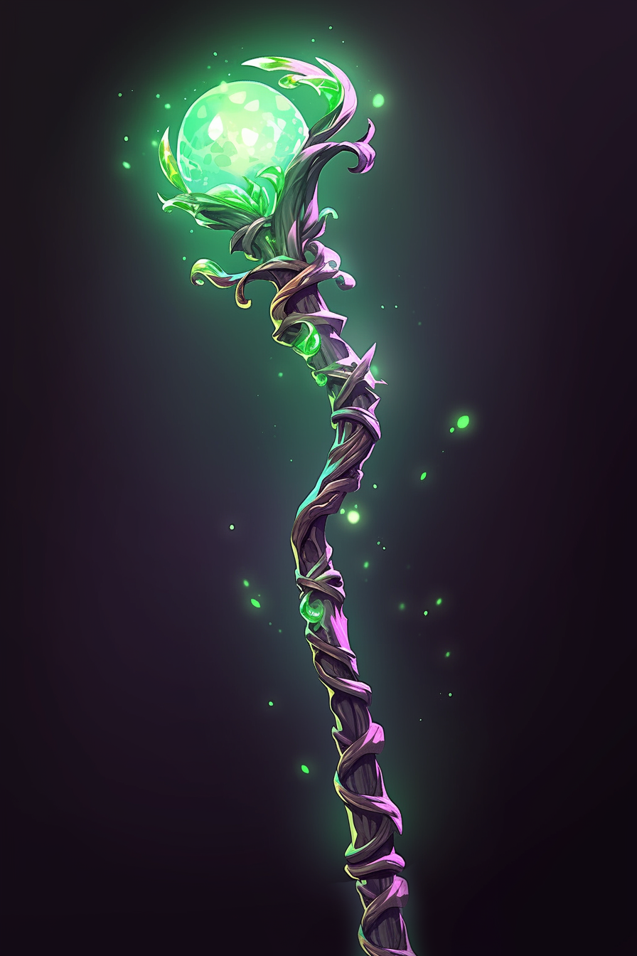 This staff appears as if it were a living tree branch. Small plants rest on the top of the staff, and it has a comforting, earthy smell. The orb pulses gently with a warm, soothing energy when the staff is held.