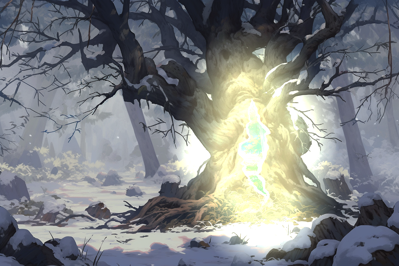 Turning to her left, she can see it coming from a couple hundred meters away. The rest of the tribe have stopped, seemingly noticing the light as well. Sage seems to recognize it, and starts walking over to it, but Dandelion stops him, saying that she should go. He nods, and holds back the rest of the tribe, allowing her privacy. Getting closer, she can see that an ancient tree is glowing from its core. When she reaches it, she sees that it is a passage through the tree, leading somewhere. She gives a small prayer to Faunus, and walks through.