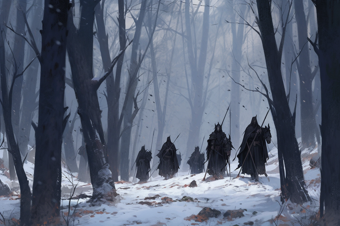 With Ravenforge disappearing over the horizon behind the party as they fly, they reach the Everdark Woods, moving north towards the Ruins of Equinfjord. Below them in the forest they see various life, both animals and monstrosities, living their lives, trying to survive in the cold of winter. Flying as clouds, they stay low, but not too low as to be discovered. Eventually, after a couple of hours, the party can see ruins peering over the treeline. They have reached their destination, and so begin to ascend in order to get a good overview of the city.