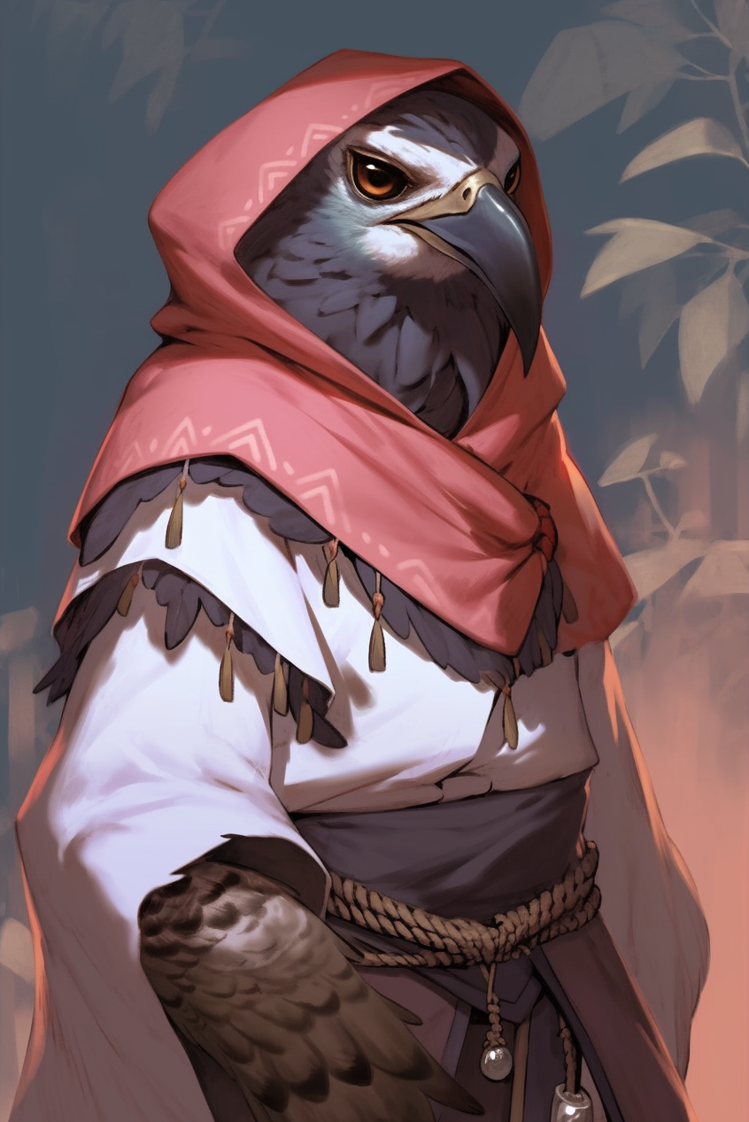 A very reserved Aarakocra who serves as a messenger and scout, who regularly flies high above the commune to scout for danger and look for visitors.