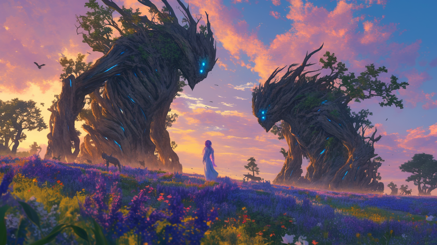 They continue to walk on the path, and before they realize it, find themselves in a vast, beautiful field of green, with scattered trees, flowerbeds, and the odd animal here and there. Nowhere can they see the forest or lake, and no mountains are visible. It’s like they’ve stepped through to a hidden gem, away from all the dangers of the world.