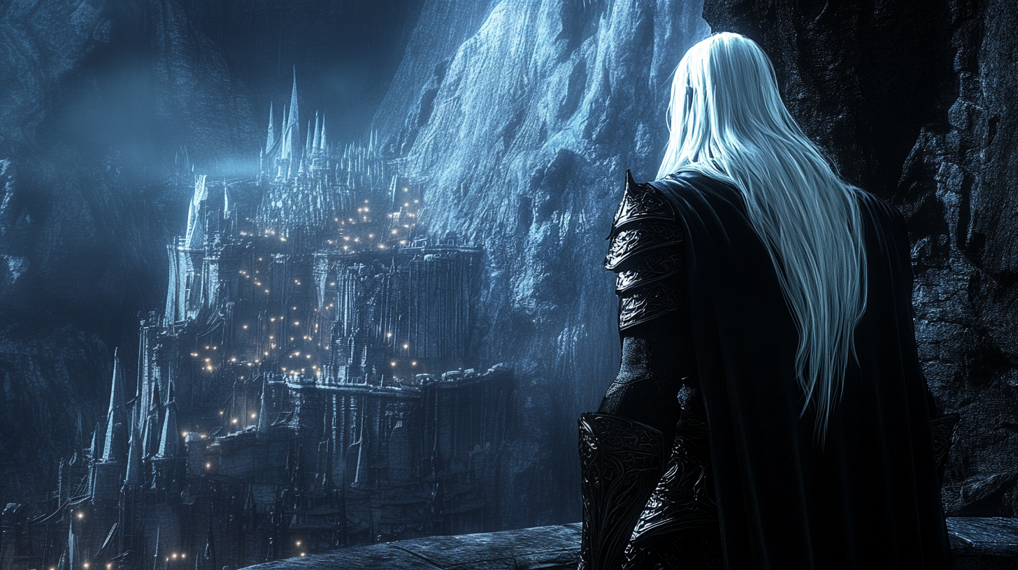 Thistlethorn peers into the mirror, using the sending stone they took from him as a focus, and finds herself dragged into a vision. She looks around herself and sees that she is in a massive underground cavern, big enough to house an entire city, which spans out in front of her, with a river running through it, ending in a waterfall that leads to an underground lake far below. She’s standing on a balcony, with the visage of Nezznar standing in drider form in front of her. He’s speaking to someone, a drow woman dressed in fine red robes.