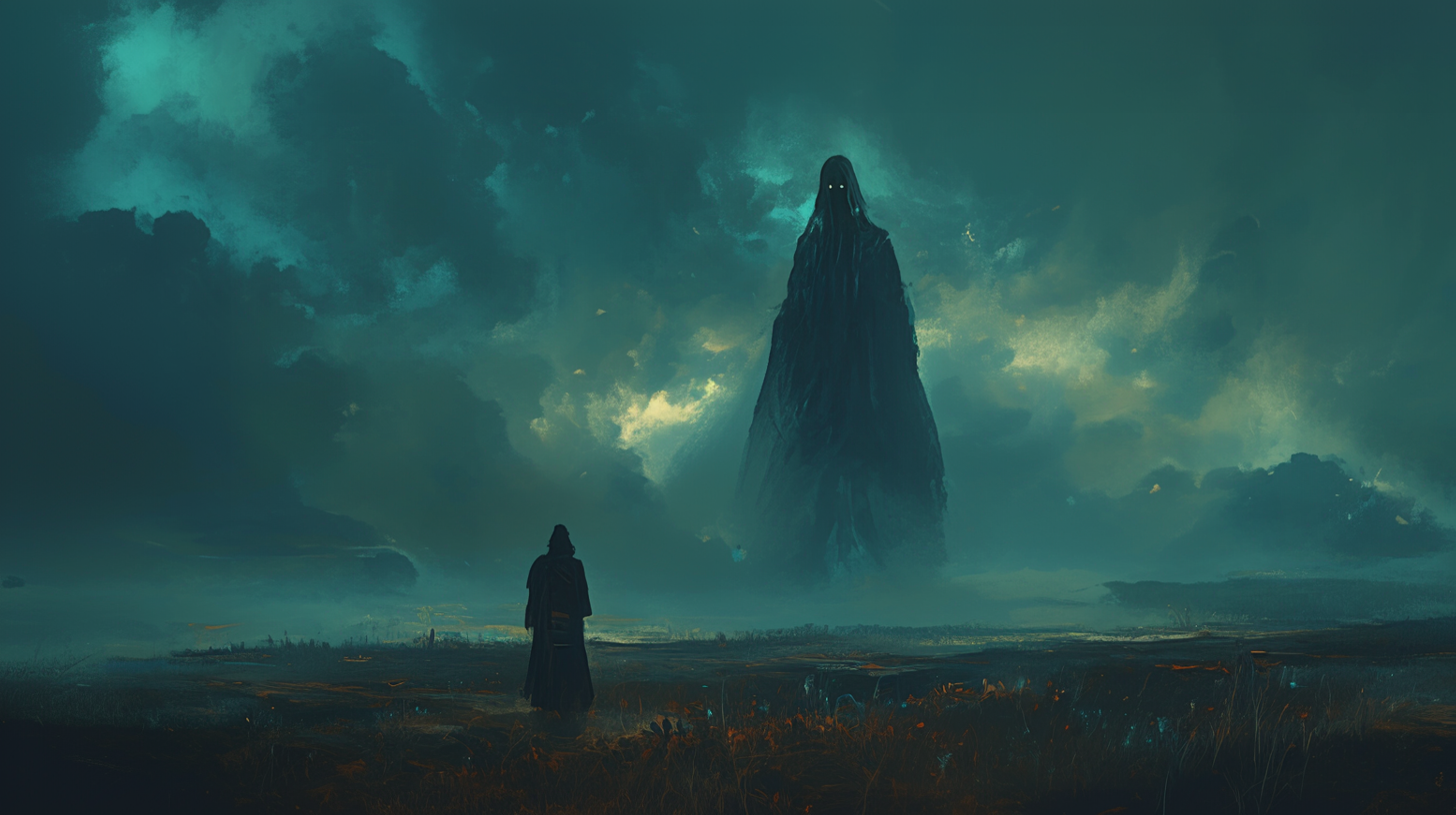 She feels the presence of something divine, so she carefully trudges forward, looking around for any sign of danger. She soon notices that she is not alone, as a massive hooded spectre walks toward her from the edge of the platform. The tall, towering figure looks down at her with glowing white eyes, the only discernible part underneath the hood. It speaks in a croaked, old tongue.