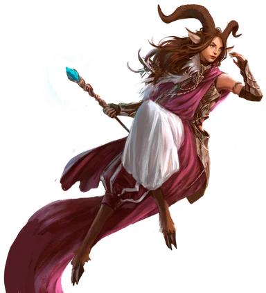 Fauns resemble humanoid goats with curving horns, square pupils, and cloven hooves. Though their appearances may vary, most fauns have a humanoid torso and a goatlike lower body covered in dense fur. Faun faces can be more caprine or more humanlike, and they have a wide variety of ear and horn shapes. Faun horns range from short with minimal curvature to much larger with a distinct curl. The average faun ranges from 4 feet to 6 ½ feet tall, but their height can change dramatically from one moment to the next based on their stance. The majority of fauns have proportionately long limbs, no matter their size or shape, and are known for their ability to deliver powerful blows with their split hooves. Fauns live for roughly 225 years, and as they age, their appearance can become increasingly goatlike.