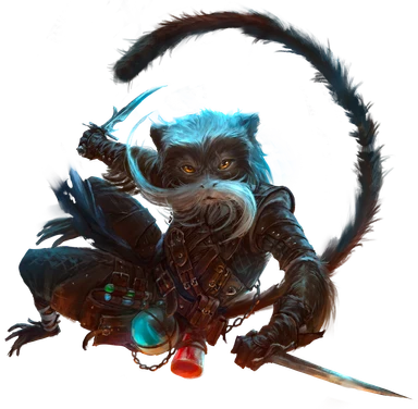 Simiah resemble anthropomorphic monkeys and apes with long limbs and prehensile feet. While their appearance reflects all simian creatures, from the largest gorilla to the smallest marmoset, their size does not align with their animal counterparts, and they can be anywhere from 2 to 6 feet tall. All simiah can use their dexterous feet for nonverbal communication, work, and combat. Additionally, some also have prehensile tails that can grasp objects or help with balance during difficult maneuvers. These traits grant members of this ancestry unique agility that aids them in a variety of physical tasks. In particular, simiah are skilled climbers and can easily transition from bipedal movement to knuckle-walking and climbing, and back again. On average, simiah live for about 100 years.