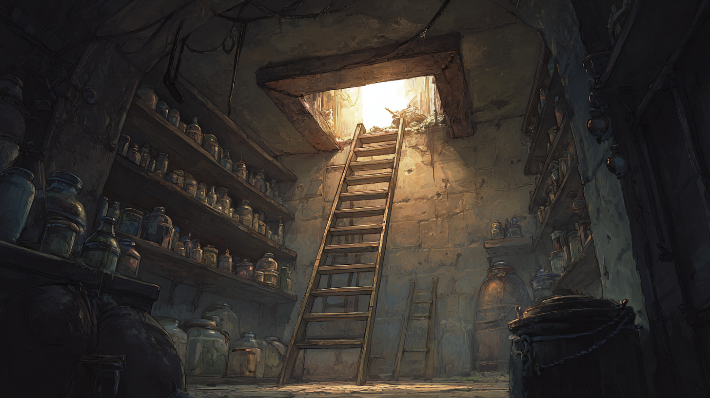 Miryks, in the meantime, has turned herself into a spider, and is wandering around the inn to find a way inside. She spots an open window that leads to what appears to be the basement, but with no light, it is hard to navigate. She eventually finds a large vat with some kind of liquid inside. It smells sour, almost like vomit, so she decides to take a sample of it. She comes out of the spider shape, and begins to look around for a vial to keep it inside, noticing that every single bottle in the basement is perfectly placed and inventoried, which is unusual.