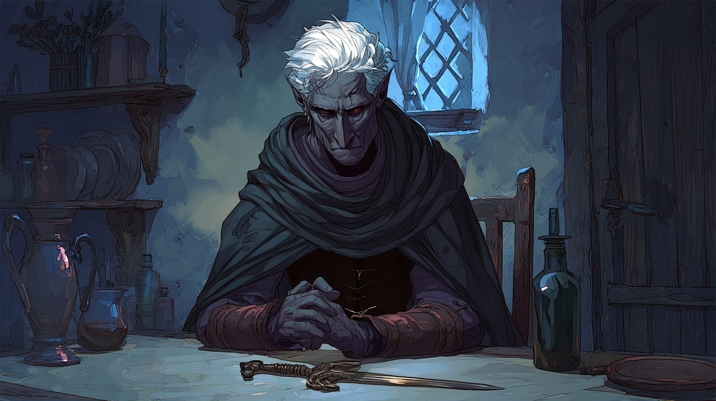 As she steps across the threshold, the world goes silent, as her connection to the patron is severed. She looks startled, but the old drow assures her that she is all right, the wards he has put in place shields the cottage from both eyes and ears, so “he” cannot hear them. He gestures for her to join him, so Raenerys goes over to sit across from him on the other chair. The room is sparsely furnished, with a simple bed, a small kitchen area, and the table. Next to the bed is a small blanket, presumably for the creature to sleep.