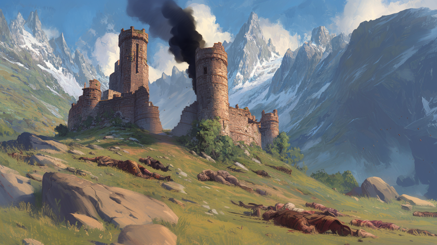 A few hours east of Riverside Crossing, they spot the fort up in the hillside. There is smoke billowing out from the center courtyard, and bodies litter the field outside of it. One of the bodies is that of an illithid, riddled with arrows like the others, all coming from the fort. The other bodies appear to be humanoids of various races, but no warriors amongst them, mostly farmers and commoners.