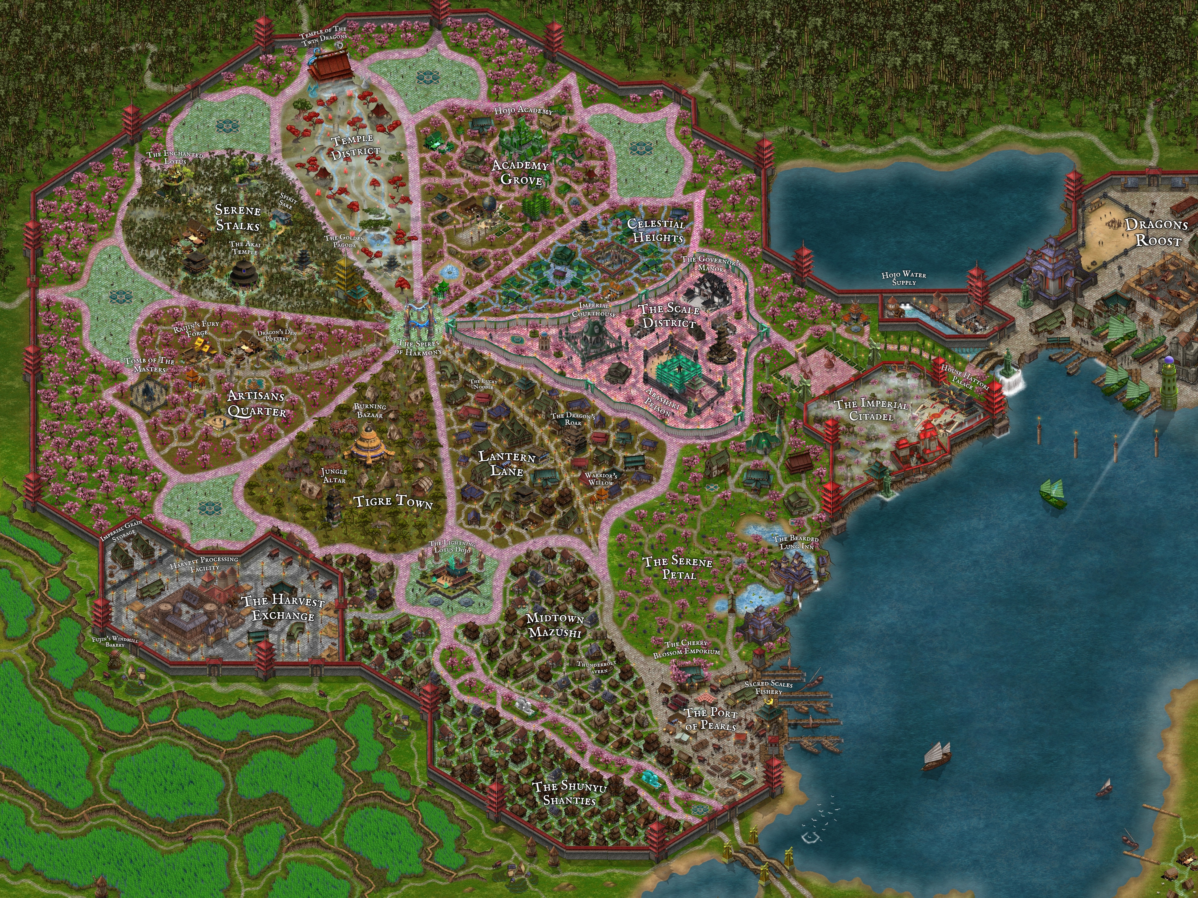- Port of Pearls: The city’s bustling harbor south of Serene Petal, home to thriving enterprises like the Sacred Scales Fishery and the illustrious trading center, The Cherry Blossom Emporium Emporium, crucial for commerce and diplomacy alike.