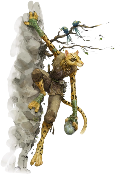 Hailing from The Sands of Serrakhan within Osira, wandering tabaxi are catlike humanoids driven by curiosity to collect interesting artifacts, gather tales and stories, and lay eyes on all the world's wonders. Ultimate travelers, the inquisitive tabaxi rarely stay in one place for long. Their innate nature pushes them to leave no secrets uncovered, no treasures or legends lost. Tabaxi were taller than most humans at six to seven feet. Their bodies were slender and covered in spotted or striped fur. Like most felines, Tabaxi had long tails and retractable claws. Tabaxi fur color ranged from light yellow to brownish red. Tabaxi eyes were slit-pupilled and usually green or yellow. Tabaxi were competent swimmers and climbers as well as speedy runners. They had a good sense of balance and an acute sense of smell.