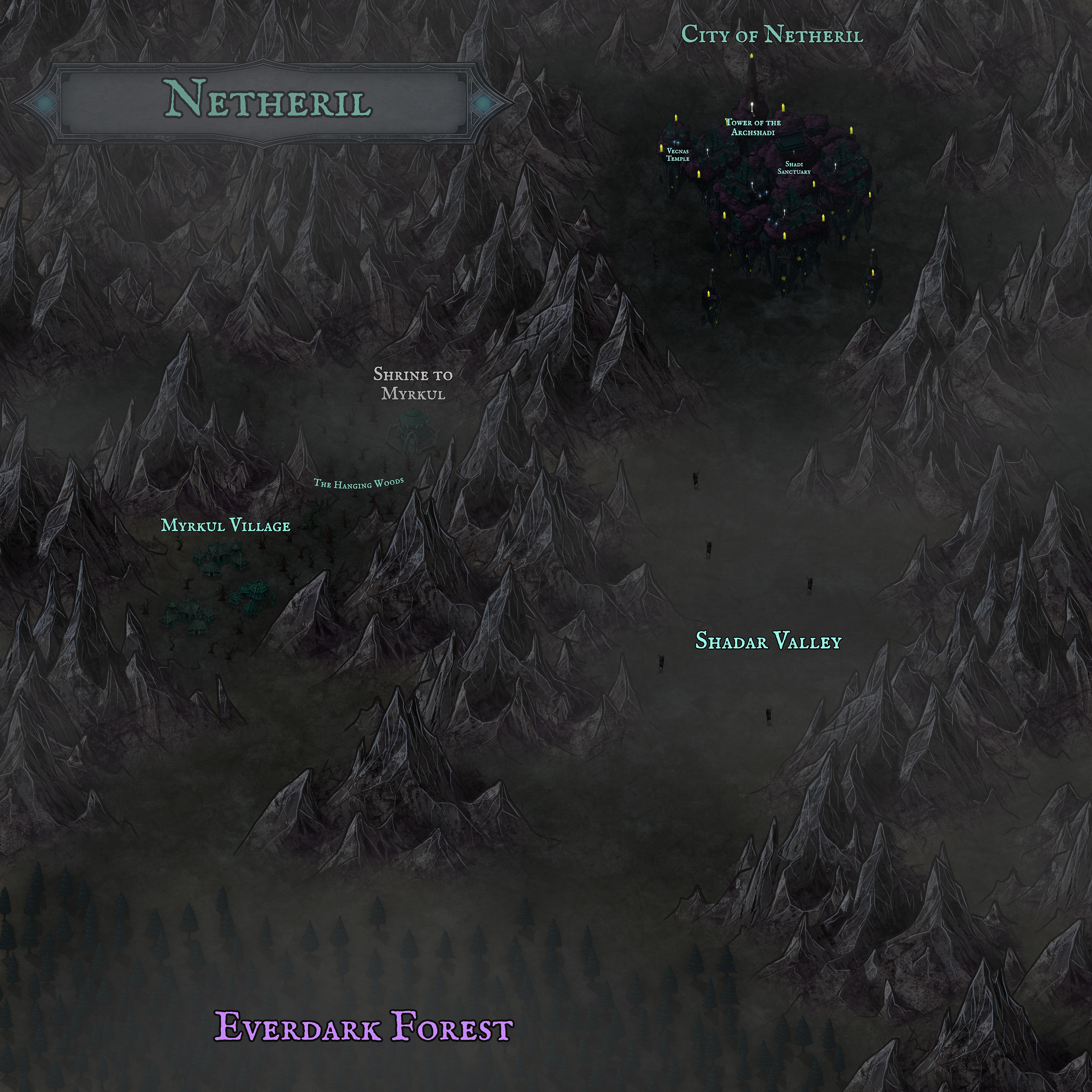 The long lost land of Netheril was hidden in the furthest recesses of the The Netherveil, said to be home to an ancient civilization of once humanoid mages, slowly turned to Shades over their time in the Netherveil. Rumored to have been the sole survivors of the second continuum crisis, these mages of the Shadi Order were led by the then Archmage Valekith, within the Floating City of Netheril, crown capital of the empire of Netheril. In the early ages of creation, Valekith utilized the Soulmonger Crystal which consumed the souls of the unwitting citizens in the world below to create a rift to The Netherveil in which to escape the cataclysmic destruction event. Over many centuries, the citizens of the once elegant city have turned to the ways of the Shadi order, dark mages which manipulate the arcane shadow energy of their new plane. Ever since the events of the past, the floating city of Shades has consumed the souls of those who follow its path, in hopes of one day returning to the material plane...