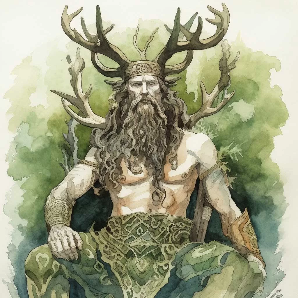 King Cernunnos, the Horned Lord, is a towering figure of strength, wisdom, and primal power. His emerald-green skin glistens with the dew of ancient forests, and his glowing amber eyes seem to pierce through to the soul. Massive antlers crown his head, entwined with vines, moss, and blooming flowers that shift with the seasons. Draped in robes woven from living foliage, he carries the presence of both a sovereign and a guardian. His commanding aura can calm the wildest beasts or instill fear in the fiercest foes.