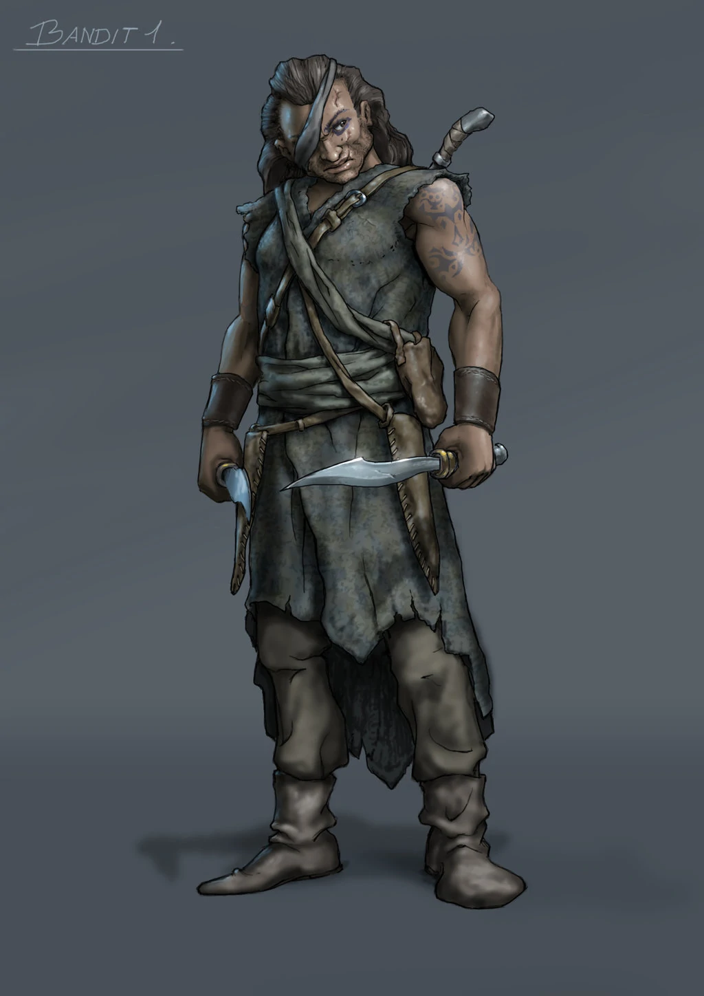 Kezen One-Eye was a marauder bandit captain who lived within the sewers beneath the City of Evernight. Leading a cruel group of savage bandits, he plundered valuables from surface dwellers before returning his ill-gotten spoils to his sewage ridden hideout. Coming into consistent conflict with the resident hag, Ritzel the Rat Queen, Kezen lost an eye to her treachery before killing many of her Wererat spawn in retaliation. Encountering the Illithid spawn, Ghad'Rah (Gibbly) within the sewers, Kezen witnessed his band of rogues murdered before his one eye, before nearly dieng himself and escaping down a sewer pipe to save his skin.