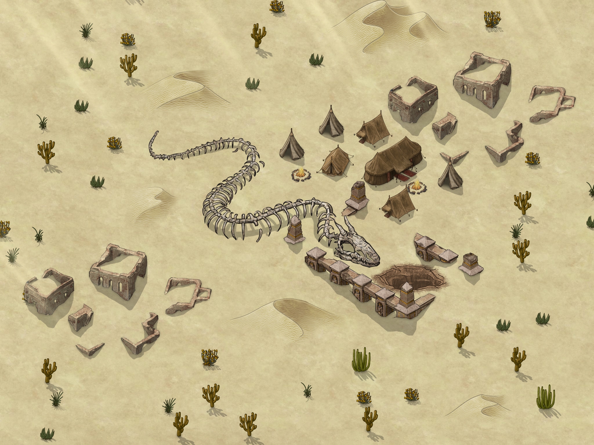 The site of the great serpents demise at the hands of Malekith, the serpent's shrine was a religious site for the infamous Snake Cult which at one time spread across the entirety of The Sands of Serrakhan. Home to the whitened bones of the ancient Wyrm, the Snake Cult practiced frequent cult rituals to create Yuan-ti Pureblood abominations and eventually resurrect The Great Serpent himself through the power of Rozan's Eye.
