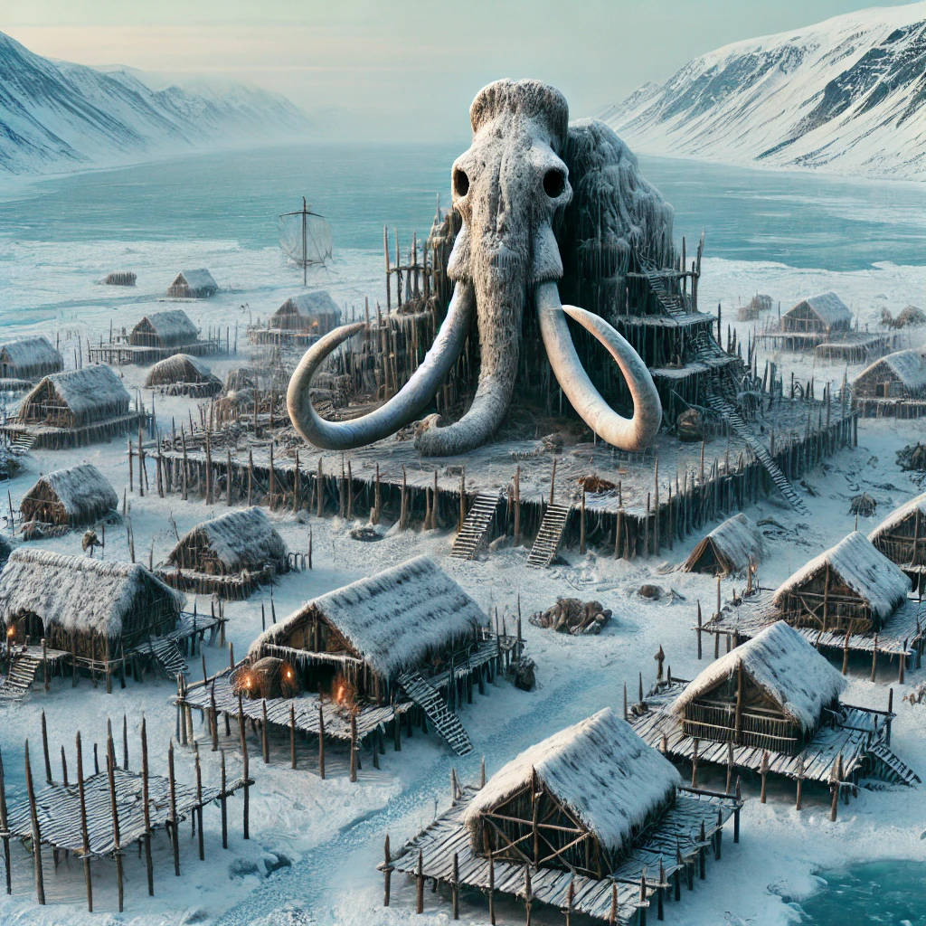 Valhrafnar Village is situated on the icy surface of a once-thriving river, now completely frozen over due to the perma-frost. The village’s buildings are rugged and imposing, constructed from the bones of massive mammoths hunted in the surrounding tundra and stilted wood harvested from the sparse forests nearby. The centerpiece of the village is the chieftain’s longhall, a colossal structure built from the skull of a legendary mammoth said to have been slain by Valkur, the tribe's warrior-god, with his bare hands.