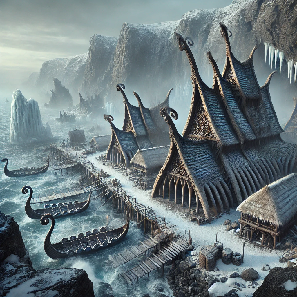 Situated upon the frozen seas of Norska, Bloddvergur now serves as a staging ground for the tribe’s raids on coastal villages. The once thriving fishing village has become a fortress of sorts, from which warriors launch their longboats across the icy waters to pillage and plunder. The tribe’s longboats, crafted from the bones of sea serpents and reinforced with iron and timber, are built for speed and durability, allowing the Bloddvergur raiders to strike quickly and retreat before their enemies can react.
