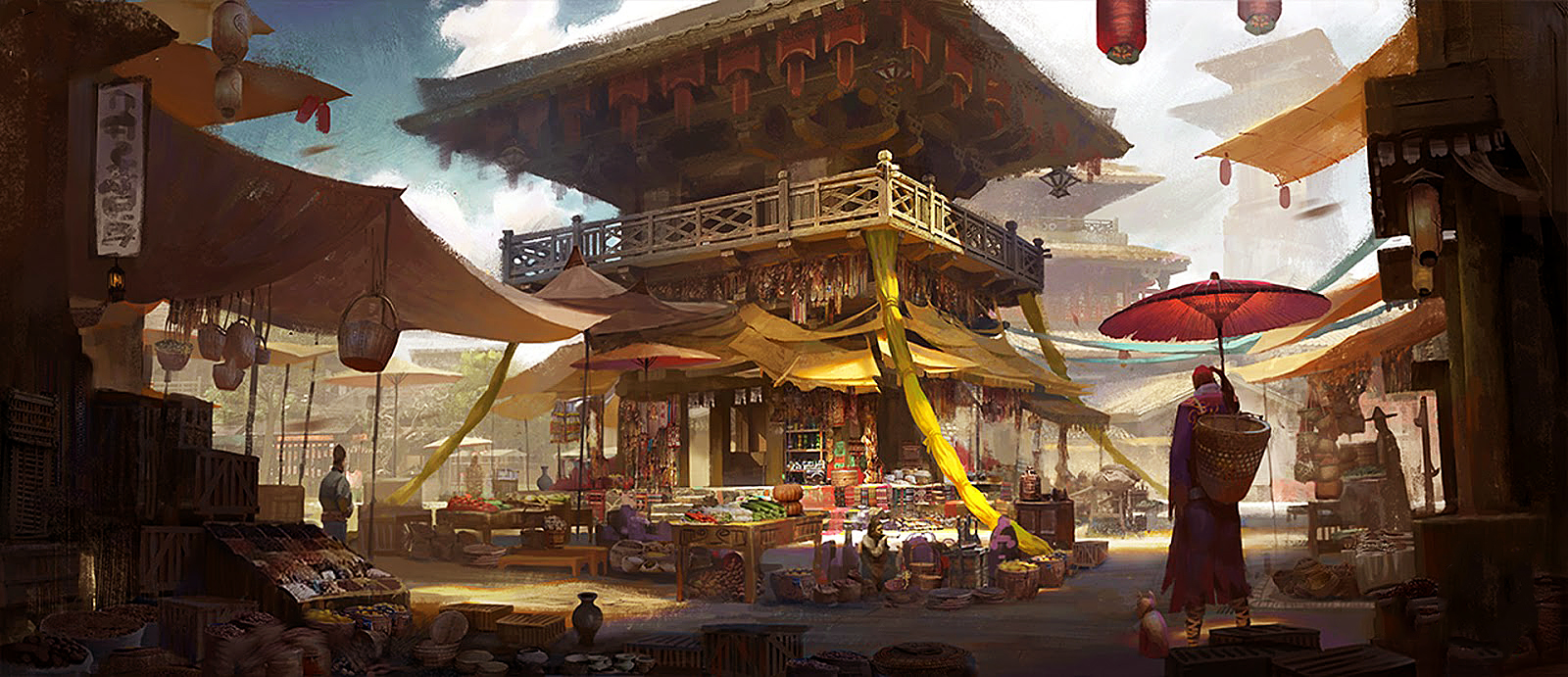 The Cherry Blossom Emporium is a grand and elegant establishment in the heart of the City of Hojo. The shop is a large two-story building made of polished dark wood and decorated with intricate carvings and delicate cherry blossom motifs. The windows are made of frosted glass and display various exotic and rare items from the Sakura Spirit Woods. The entrance is a large set of double doors, flanked by two cherry blossom trees that bloom all year round.