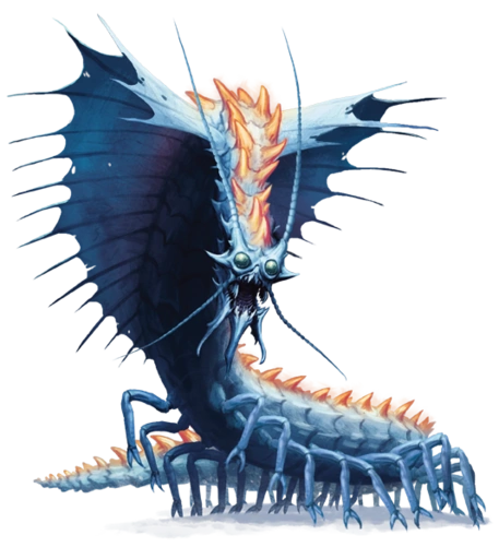 A remorhaz, also known as a polar worm or ice worm, was a monstrous beast resembling a cross between a worm and a centipede. A remorhaz was a creature that thrived in cold environments, particularly arctic regions, such as The Vale of Everwinter. A remorhaz had leathery tough wings (which it could not use to fly), an insect-like head, and a 40 feet (12 meters) scaly body. It was ice-blue in color, had dozens of legs, and its back glowed red with an inner fire that could melt all but the strongest of metals. It had horns along its body and dagger-like teeth. It naturally had very high magic resistance. A remorhaz produced an incredible amount of heat, allowing it to take advantage of the vulnerability that many creatures in its native environment possessed. Its heat also allowed it to melt nonmagical weapons that struck its red-hot protrusions. A remorhaz liked to wait in ambush for its potential prey. When a living creature drew near, the remorhaz sprang from the ground and struck. It primarily used its teeth in combat, or swallowed its opponent whole and subjected it to its gizzard and fiery insides.