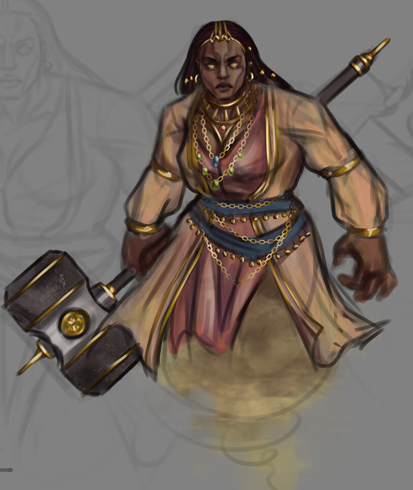 Sabel's chamber is a haven of tranquillity amidst the bustling undercity, an echoing cavern where the walls have been shaped into intricate murals depicting the Dao's history and their reverence for the earth. Here, she performs her mystical rites, drawing upon the power of the earth to restore vitality to the wounded and ill. Sabel is a master of Earth-Rifting magic, able to call forth the healing energies within the soil, stones, and crystals of the Underland. She infuses her patients with these life-giving forces, sealing wounds with molten metal, purifying infections with crushed gemstone elixirs, and easing pain with warmed, therapeutic muds.