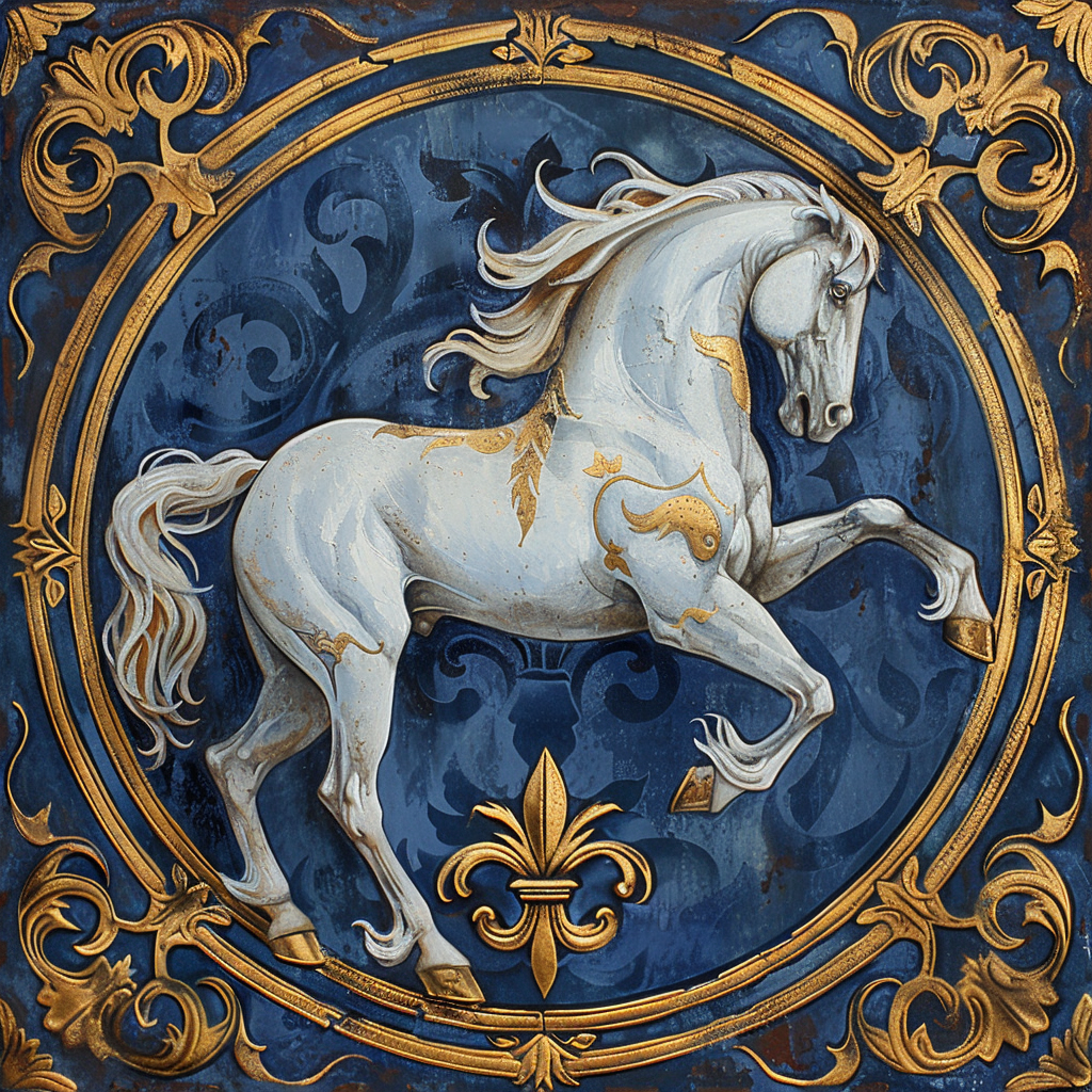The crest of House De Montfort depicts a majestic white horse rampant, adorned with a golden fleur-de-lis, set against a field of royal blue. This emblem symbolizes the house's noble heritage, chivalry, and martial prowess.