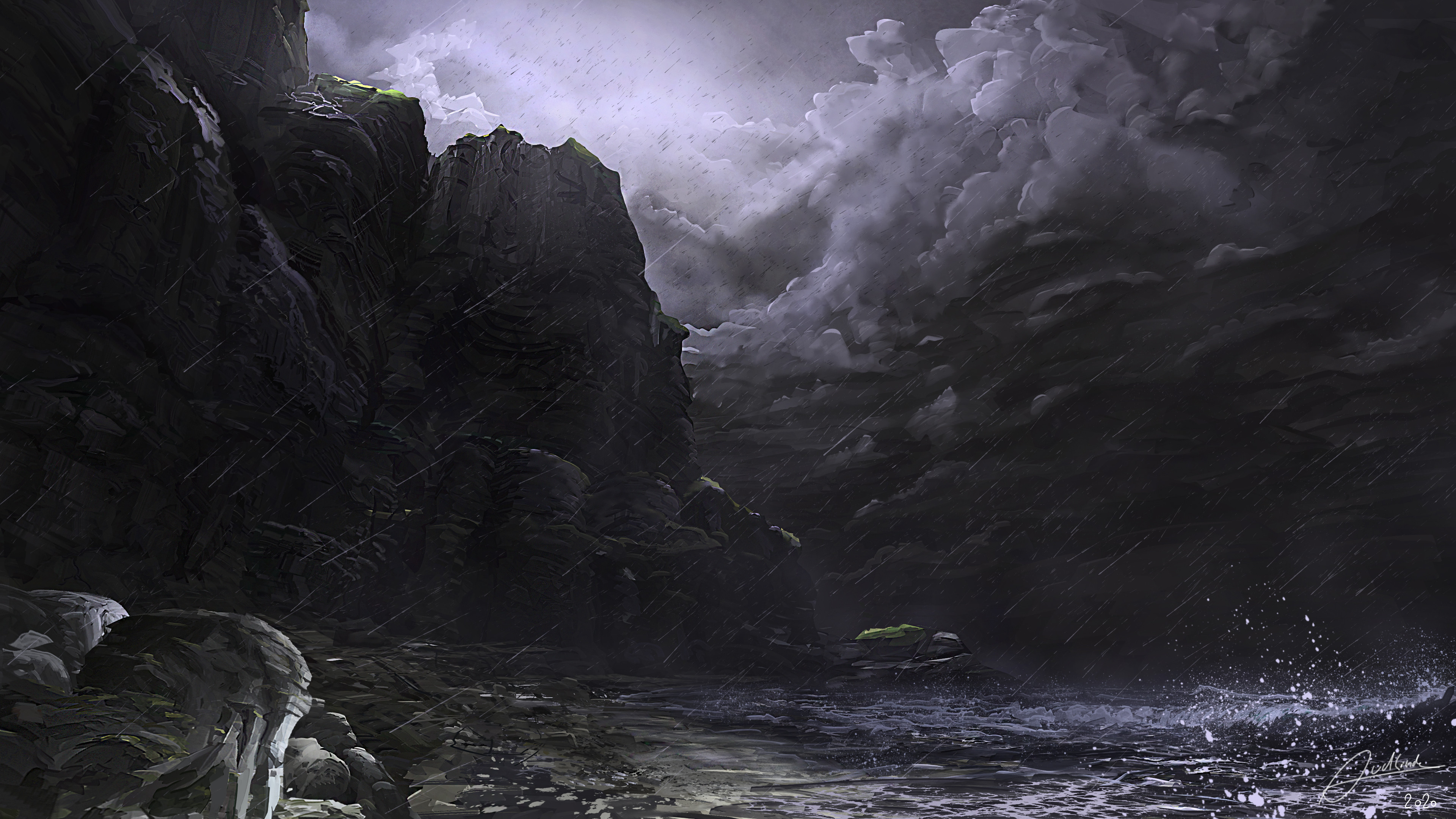The Ashen Coast is a rugged and desolate volcanic shoreline, where the scorching breath of Unknown meets the icy gales of the Unknown, creating a maelstrom of volatile weather and a landscape of smoldering ruin. It stretches along the north western rim of the Fields of the Frenzied Flame Flame, forming a natural border between the blazing heartlands of fire and the frozen fjords of Norska. The coastline is forged of volcanic and igneous glass, its jagged shores gleaming like shattered obsidian, forever shaped by the torrential storms that ravage its surface.