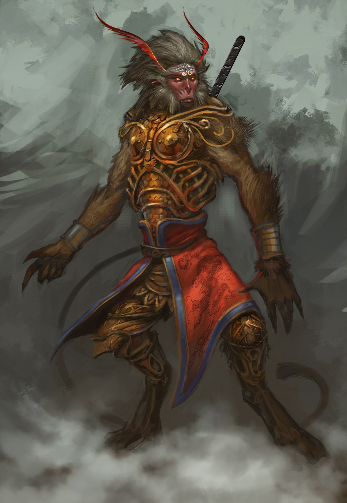 Legend claims Jinzao was born when Raijin's lightning struck a mountain fig tree already tangled in vines, shattering it upward instead of down. From that rupture leapt a laughing simian spirit, eyes burning gold, staff in hand. He claimed the canopy before the ground ever knew him.