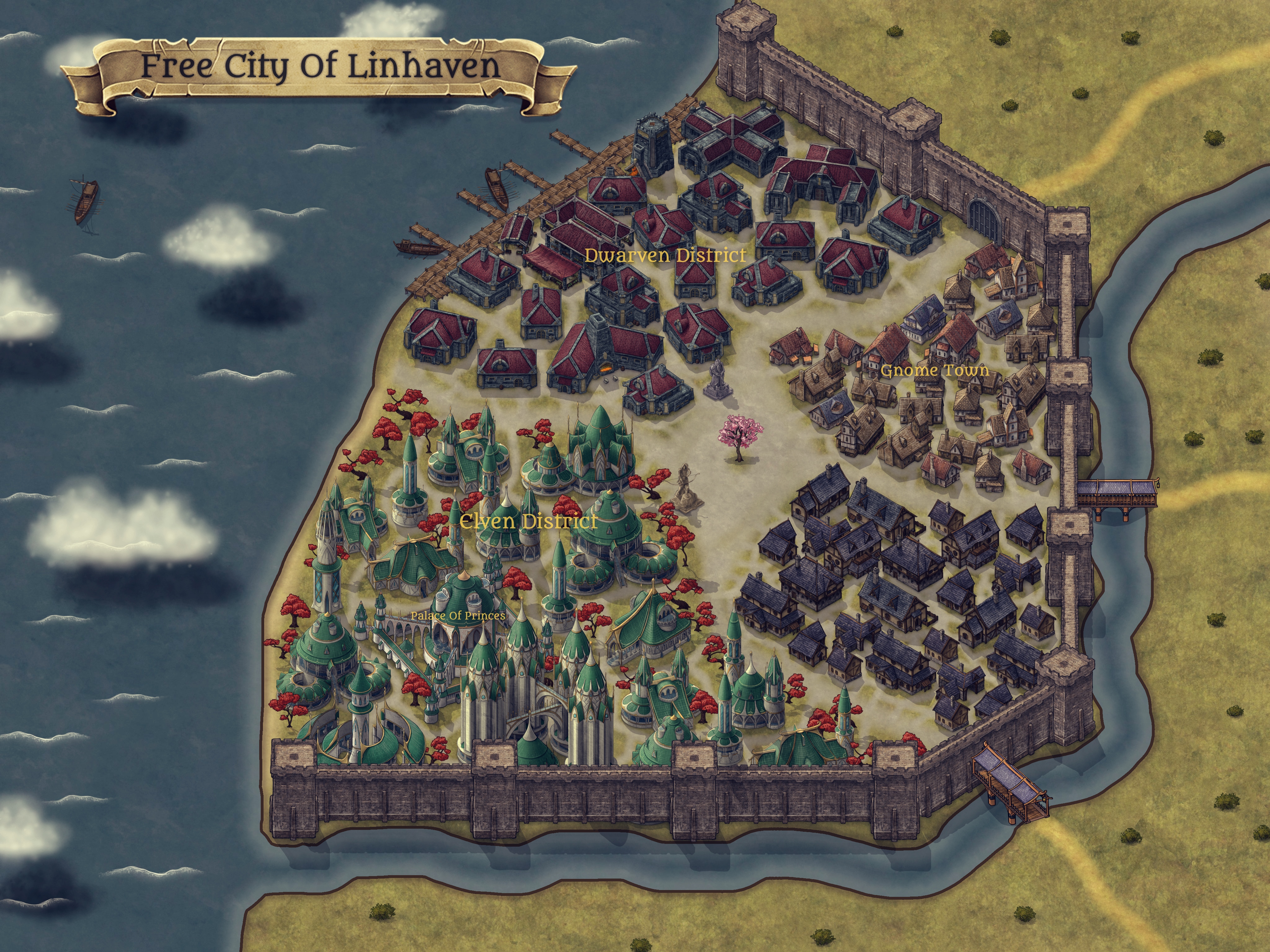 Ruled by an elected prince, the city of Linhaven has long been a refuge for the diverse races and peoples of Tolria. With prominent districts for dwarven, elven, and halfling residents, the city has prospered through continued trade to the Northern Kingdoms and southern empire of Bastile.