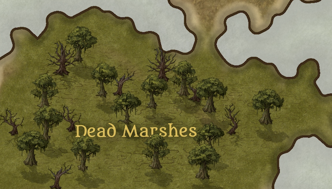A vast expanse of fauna overgrowth and muddied still water, spanning miles on end, the dead marshes has been the fate of many lost travelers and sea explorers alike. Dubbed the dead marshes due to the sheer amount of casualties inflicted upon expedition crews and voyage attempts into the marshes, as well as rumors of elven wraiths roaming the swamps in long-forgotten ruins.