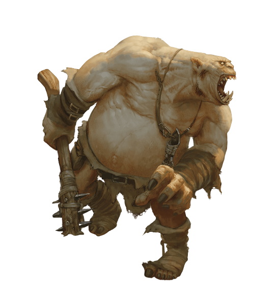 Ogres were a race of Giant-kin, standing between nine to eleven feet tall with very muscular bodies and large heads. They were a lazy and brutish race with notoriously quick tempers, and were willing to eat almost anything. Their avaricious nature would often lead them distrust one another and incite squabbling over treasure. Despite their lack of intelligence, they were often employed by smarter or stronger creatures as guards, as they were physically imposing enough to ward away most trouble.