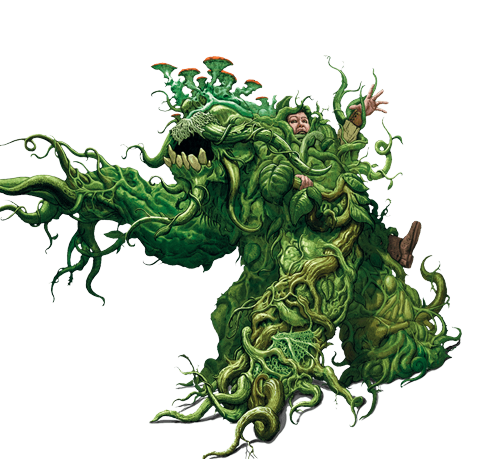 Monstrous Plant-like creatures with all-consuming appetites, the shambling mound was a formidable and terrifying amalgamation of organic material. They typically resembled a grotesque weave of vines, mosses, and rotting vegetation intertwined into a humanoid shape; their thick, fibrous bodies were covered in slimy mottled green and brown patches. Their massive limbs ended in grasping tendrils tipped with sharp thorns or gnarled roots, which were used to ensnare prey and crush them into submission.